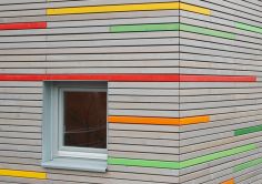 Um ausreichend Raum zu schaffen, schwebt der Baukörper weit ausladend über dem Erdgeschoss. Große Fenster sorgen für reichhaltiges Licht und Ausblicke in den Gemeindegarten. Die Farben der fein gegliederten Holzleisten-Fassade spielen mit den Wind- und Himmelsrichtungen.