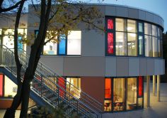 Hohe luftige Räume mit farbigem Glas in den Öffnungsflügeln sorgen für eine heitere und großzügige Atmosphäre für Kinder und Mitarbeiter und verwandeln das Gebäude in den dunklen Morgen- und Abendstunden in eine bunte Laterne.