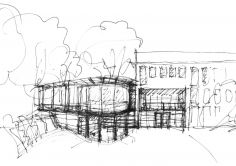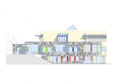 Der Mehrzweckraum im OG kragt mit seinem großen aufgeständerten Rund über das zurückliegende Sockelgeschoss in die Außenspielfläche hinein aus. Terrassenrücksprünge und Treppenanlagen bieten zur offenen Seite eine aufgelockerte und differenzierte Anbindung an unterschiedliche neu gestaltete Freibereiche für jede Gruppe.