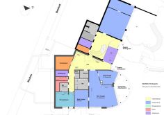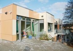 Das Farbkonzept für die HPL-Platten-Verkleidung changiert in hellen Pastelltönen passend zu den umgebenden Altbauten - insbesondere der hochwertigen Klinker-Fassade des Schulgebäudes.