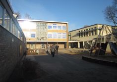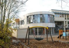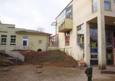Mit drei unterschiedlichen Ansichtsseiten fügt er sich auf dem großen Grundstück harmonisch ein in das vielgestaltige Ensemble aus alter Kita (1998) , Grundschule mit teilweise denkmalgeschützten Gebäuden (1873), Schulerweiterung (1959) und Turnhalle.