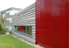Auch für die Fassade suchten wir ein Material, das neben langlebiger Robustheit im Schulalltag zu der atmosphärischen Erholungswirkung beitragen kann. Nach einigen Versuchen mit „Freiform-Knitterblechen“ entschieden wir uns für ein Kontrastprogramm aus horizontal verlegten rauhen Lärchenholz-Schwarten (niedrige lange Baukörper) und vertikal montierten gefalteten Metallprofil-Paneelen in kräftigem Rot (höhere Baukörper). Mittels unterschiedlicher Falt-Raster entsteht hier die Wirkung eines fließend bewegten Faltenwurf wie bei einem Theatervorhang .
