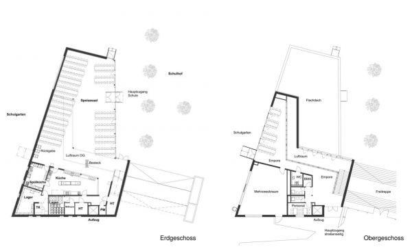 Auf zwei Ebenen entfaltet das Gebäude Raum für die große zum Schulhof orientierte Mensa im EG mit 230 Sitzplätzen, Küche und Ausgabetheke, sowie im Galeriegeschoss darüber für intimere Speisemöglichkeiten z.B. einer Gruppe in Klassenstärke mit Blick in den Schulgarten, sowie einen Multifunktionsraum für Seminare, schulische oder städtische Zusatzangebote.