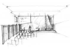 Grundlage unseres Entwurfes ist die Entscheidung, den Gottesdienstraum im Obergeschoss anzuordnen, sowie, dieses Obergeschoss durch die Verwendung des vorhangartig eingesetzten Profilbauglases im EG besonders davon abzuheben. Hierdurch erhält die Gemeinde die Möglichkeit, sich mit einem öffentlichen, vielgestaltigen, offen und großzügig gestalteten Eingangsbereich mit Foyer, Empfangstheke, Cafe, Seminarbereich, Bücherstube mit Anbindung an den Garten, der Stadtöffentlichkeit zu präsentieren.