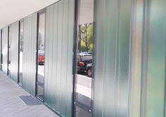 Für die Modellierung des Baukörpers war uns wichtig, eine einfache und doch einprägsame Gestalt zu gewinnen, die das Gebäude an diesem besonderen Ort unverwechselbar macht. Dazu dienen die offenen Arkaden vor dem Cafe- und Foyerbereich, die in Spannung stehen zu den großen geschlossenen Wandflächen, die auskragende geschwungene Form des Gottesdienstraumes auf der Gartenseite, sowie die zurückgesetzte Erdgeschoß-Fassade aus Profilbauglas, die am Eingang zurückweicht und einladend in die Tiefe des Raumes führt und das Gebäude zugleich durch Ein- und Ausblicke mit dem öffentlichen Raum verbindet. Alle wichtigen und die Öffentlichkeit ansprechenden Fassaden sind bewusst wie Vorhänge aus Profilbauglas in die sonst schlichten massiven Putzwände eingesetzt.