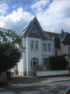 Das rheinisch-bergische ca. 1907 erbaute Jugendstil-Reihenhaus wurde zu seinem 100.Geburtstag komplett von außen saniert, gedämmt und gestalterisch verschönert. Unterstützung und Auszeichnungen gab es u.a. von der KfW-Bank aus dem CO2-Gebäudesanierungsprogramm, für Solar- u.Biomasse-Nutzung von der BAFA, sowie vom Land NRW.