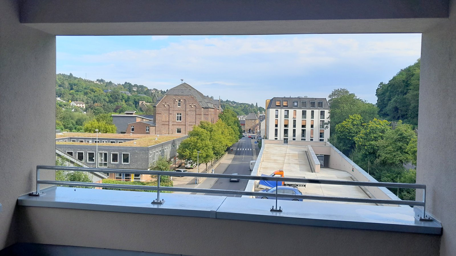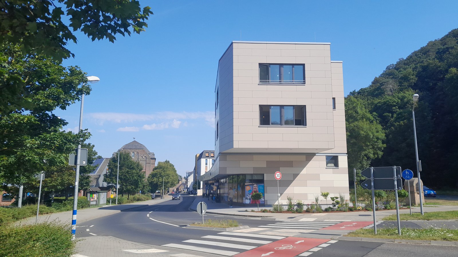 Die eingeschossige Bebauung mit dem erhöhten Kopfgebäude am Ortseingang über drei Etagen gibt Orientierung und Einleitung für den Übergang von schnellen Fahr- zum beruhigten Fußverkehr. Das 110 m lange Gebäude entlang der Trierer Straße wird von einem breiten Bürgersteig begleitet, der zum Flanieren unter einem Vordach und entlang der neuen Geschäfte einlädt.