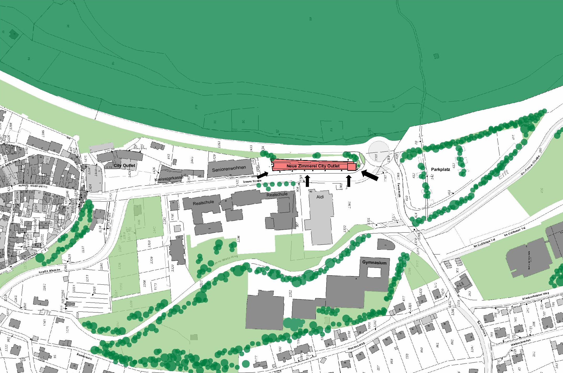 Der Weg zur historischen Altstadt von Bad Münstereifel führt für viele Besucher, die die Stadt von Süden erreichen, über die großen Parkflächen am Ortseingang an der Trierer Straße. An dieser fußläufigen Verbindung zur Altstadt ist für die Stadt mit dem Neubau des "ZIMMEREI-OUTLET-STORE“ ein neuer Auftakt entstanden.