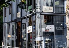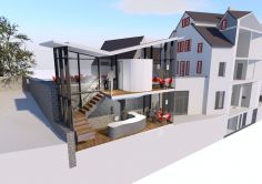 Darüber legt sich ein umgekehrtes Satteldach aufwärtsstrebend wie ein großer Flügel als modernes Pendant zu den heimeligen Altstadtdächern.