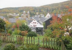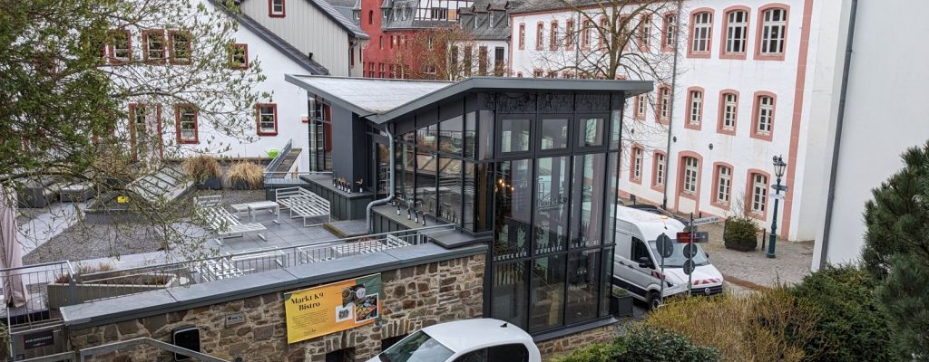 Der kleine Glaspavillon entfaltet sich auf einem Natursteinsockel bergauf wie die Stadtmauer um die zentrale Bar mit Kronleuchter über eine Empore bis auf das Dach des Bestandsgebäudes, wo eine große Dachterrasse mit Rundum-Blick auf Stadtmauer und Berghang, Rathaus und Altstadtgebäude zum aussichtsreichen Zwischen-Stop einlädt.