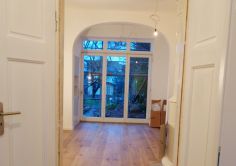 Verborgen und verdunkelt unter vielen Schichten von Plastik, Kleber, Fliesen, Teppich und Gipskarton und nachkriegserweitert um etagenweise Notbäder und Küchen in den ehemaligen herrschaftlichen Loggien war die alte märchenhafte Großzügigkeit hoher Wohnräume um eine als vertikale Raumachse fungierende gewendelte Holztreppe gerade noch zu erahnen.