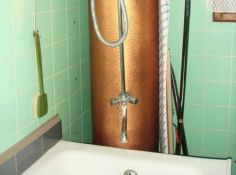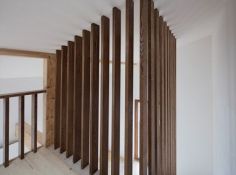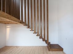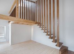 Die Raumhöhe von mindestens 2,80m Höhe lässt auch in den Mini-Apartments mit 23m² kein Gefühl von Enge aufkommen. Die noch höheren DG-Wohnungen erhielten zusätzliche Quadratmeter in Form von sorgsam geschreinerten Schlafemporen über der Badbox – die Treppen hängend an schmalen raumhohen Eichenbohlen, die in die sich kreuzenden Kraftkoordinaten der Pultdach-Pfettenkonstruktion eingefügt sind.