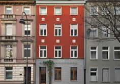 So blieb uns Korrektur und Erinnerungspflege mittels Farbe: In Referenz zum 150. Peter-Behrens-Jubiläumsjahr (P. Behrens: 1868 – 1940, Typograph, Industrie-Designer, Architekt - Erbauer und Gestalter u.a. der Berliner AEG-Werke) wurden wir unter Schrifttypen und Jugendstilornamenten des Altmeisters im Aufbruch zur Moderne fündig, ergänzten und stärkten die Dreifenstertypologie mit Jahreszahlen-Medaillons über den Fenstern und Zierbändern in Behrens markanter architektonischer Typographie. Ein kräftiges Schweden-Rot gibt einen schönen Kontrast und dem oberen Fassadenteil über dem Sockelgeschoss das ihm zustehende Gewicht.