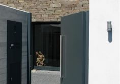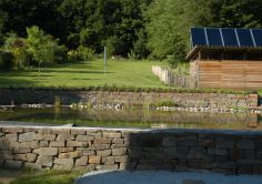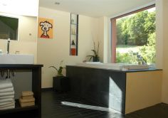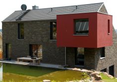 Einen überraschenden Kontrast zu der massiven Grauwacke-Fassade bildet die rote "Badbox" im DG, die aus dem Schlaftrakt über den Schwimmteich auf der Gartenseite auskragt - Wellness-Baden mit Blick auf die Rehe am Waldrand…