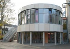 Mit drei unterschiedlichen Ansichtsseiten fügt er sich auf dem großen Grundstück harmonisch ein in das vielgestaltige Ensemble aus alter Kita (1998) , Grundschule mit teilweise denkmalgeschützten Gebäuden (1873), Schulerweiterung (1959) und Turnhalle.