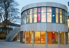 Das Farbkonzept für die HPL-Platten-Verkleidung changiert in hellen Pastelltönen passend zu den umgebenden Altbauten - insbesondere der hochwertigen Klinker-Fassade des Schulgebäudes.