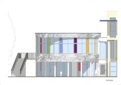 Hohe luftige Räume mit farbigem Glas in den Öffnungsflügeln sorgen für eine heitere und großzügige Atmosphäre für Kinder und Mitarbeiter und verwandeln das Gebäude in den dunklen Morgen- und Abendstunden in eine bunte Laterne.