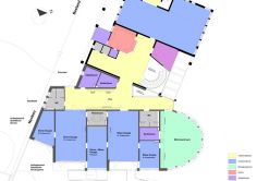 Der Mehrzweckraum im OG kragt mit seinem großen aufgeständerten Rund über das zurückliegende Sockelgeschoss in die Außenspielfläche hinein aus. Terrassenrücksprünge und Treppenanlagen bieten zur offenen Seite eine aufgelockerte und differenzierte Anbindung an unterschiedliche neu gestaltete Freibereiche für jede Gruppe.