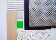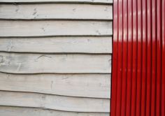 Auch für die Fassade suchten wir ein Material, das neben langlebiger Robustheit im Schulalltag zu der atmosphärischen Erholungswirkung beitragen kann. Nach einigen Versuchen mit „Freiform-Knitterblechen“ entschieden wir uns für ein Kontrastprogramm aus horizontal verlegten rauhen Lärchenholz-Schwarten (niedrige lange Baukörper) und vertikal montierten gefalteten Metallprofil-Paneelen in kräftigem Rot (höhere Baukörper). Mittels unterschiedlicher Falt-Raster entsteht hier die Wirkung eines fließend bewegten Faltenwurf wie bei einem Theatervorhang .