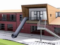Die heterogene bis disparate Wohn- und Mischbebauung der Umgebung erschien uns als eine stumme Aufforderung, für diese Aufstockung die angepassten traditionellen Baukörperformen zu verlassen und einmal den Ritt zu wagen – der Spannung erzeugt und hoffentlich das Kinderherz erfreut.