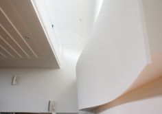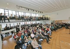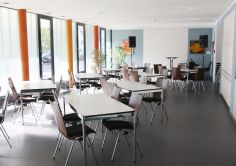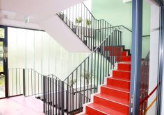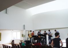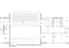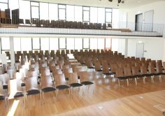 Ein von oben wiederum durch eine Glasfassade aus Profilbauglas belichtetes großzügig gestaltetes Treppenhaus lädt ein ins „piano nobile“, nach dem Vorbild städtischer Bürgerhäuser, dem „vornehmen“ Obergeschoss mit Foyer und Gottesdienstraum, Raum der Stille (Erker ebenfalls aus Profilbauglas) und Bürobereich, sowie den Kinderräumen im DG. Als geistliches Modell für diese Raumanordnung kann die Tempelanlage der alttestamentlichen Tradition dienen, die mit ihrer Abfolge von Vorhöfen einen schrittweisen Zugang zum Heiligtum gerade in Anbetracht einer multikulturellen und multireligiösen Umwelt formulierte. Damit wird, übertragen auf ein zeitgemäßes Gemeindemodell, auf der einen Seite im Erdgeschoss ein niedrigschwelliger attraktiver Zugang für alle angeboten, auf der anderen Seite aber der Ort der Gottesbegegnung aus dem Alltag herausgehoben. Der Zugang zum Gottesdienstraum bedarf der bewussten Entscheidung und Hinwendung und wird so in besonderer Weise als Kraftquelle und festlicher Gemeinschaftsraum wirksam.