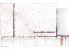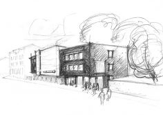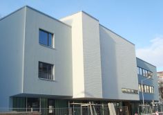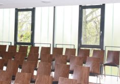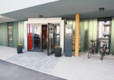 Für die Modellierung des Baukörpers war uns wichtig, eine einfache und doch einprägsame Gestalt zu gewinnen, die das Gebäude an diesem besonderen Ort unverwechselbar macht. Dazu dienen die offenen Arkaden vor dem Cafe- und Foyerbereich, die in Spannung stehen zu den großen geschlossenen Wandflächen, die auskragende geschwungene Form des Gottesdienstraumes auf der Gartenseite, sowie die zurückgesetzte Erdgeschoß-Fassade aus Profilbauglas, die am Eingang zurückweicht und einladend in die Tiefe des Raumes führt und das Gebäude zugleich durch Ein- und Ausblicke mit dem öffentlichen Raum verbindet. Alle wichtigen und die Öffentlichkeit ansprechenden Fassaden sind bewusst wie Vorhänge aus Profilbauglas in die sonst schlichten massiven Putzwände eingesetzt.