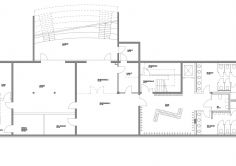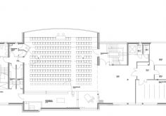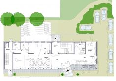 Grundlage unseres Entwurfes ist die Entscheidung, den Gottesdienstraum im Obergeschoss anzuordnen, sowie, dieses Obergeschoss durch die Verwendung des vorhangartig eingesetzten Profilbauglases im EG besonders davon abzuheben. Hierdurch erhält die Gemeinde die Möglichkeit, sich mit einem öffentlichen, vielgestaltigen, offen und großzügig gestalteten Eingangsbereich mit Foyer, Empfangstheke, Cafe, Seminarbereich, Bücherstube mit Anbindung an den Garten, der Stadtöffentlichkeit zu präsentieren.
