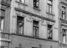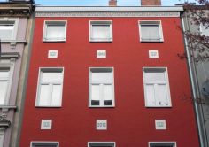 So blieb uns Korrektur und Erinnerungspflege mittels Farbe: In Referenz zum 150. Peter-Behrens-Jubiläumsjahr (P. Behrens: 1868 – 1940, Typograph, Industrie-Designer, Architekt - Erbauer und Gestalter u.a. der Berliner AEG-Werke) wurden wir unter Schrifttypen und Jugendstilornamenten des Altmeisters im Aufbruch zur Moderne fündig, ergänzten und stärkten die Dreifenstertypologie mit Jahreszahlen-Medaillons über den Fenstern und Zierbändern in Behrens markanter architektonischer Typographie. Ein kräftiges Schweden-Rot gibt einen schönen Kontrast und dem oberen Fassadenteil über dem Sockelgeschoss das ihm zustehende Gewicht.