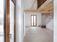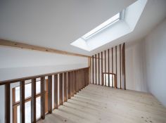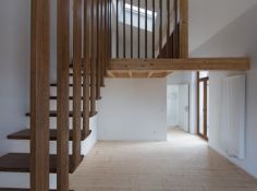 Die Raumhöhe von mindestens 2,80m Höhe lässt auch in den Mini-Apartments mit 23m² kein Gefühl von Enge aufkommen. Die noch höheren DG-Wohnungen erhielten zusätzliche Quadratmeter in Form von sorgsam geschreinerten Schlafemporen über der Badbox – die Treppen hängend an schmalen raumhohen Eichenbohlen, die in die sich kreuzenden Kraftkoordinaten der Pultdach-Pfettenkonstruktion eingefügt sind.