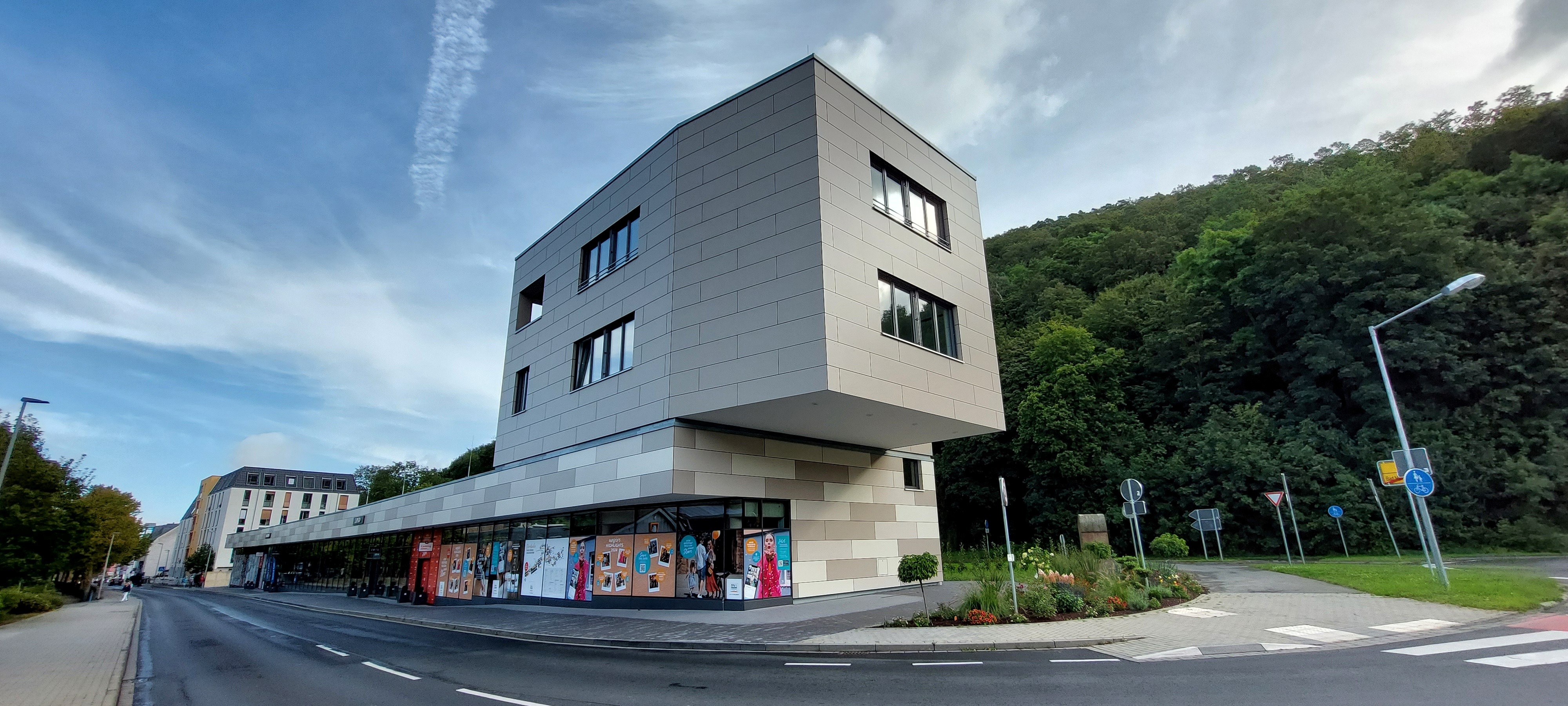 Im Oktober 2023 feierte ein weiterer Neubau an der Trierer Straße Richtfest. Auf dem Gelände der Alten Zimmerei entstand nicht nur zusätzliche Verkaufsfläche, sondern ein gemischt genutzter Gebäudekomplex mit Dachparkfläche, E-Ladestationen, PV-Anlage, Penthouse und Schulungszentrum. So wurde aus Wiederaufbau Zukunftsarbeit – für eine lebendige, resilientere Innenstadt Bad Münstereifel.