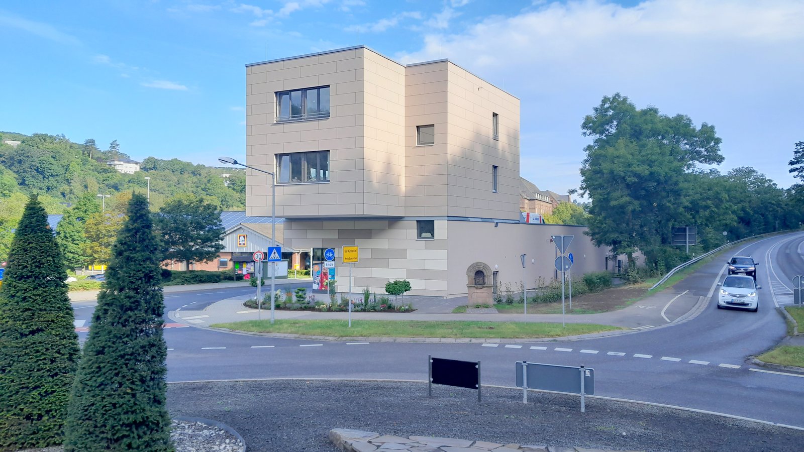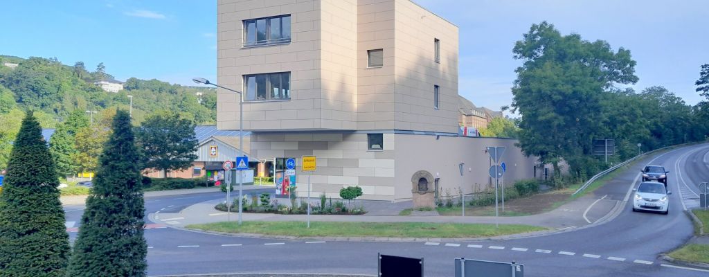Die eingeschossige Bebauung mit dem erhöhten Kopfgebäude am Ortseingang über drei Etagen gibt Orientierung und Einleitung für den Übergang von schnellen Fahr- zum beruhigten Fußverkehr. Das 110 m lange Gebäude entlang der Trierer Straße wird von einem breiten Bürgersteig begleitet, der zum Flanieren unter einem Vordach und entlang der neuen Geschäfte einlädt.