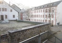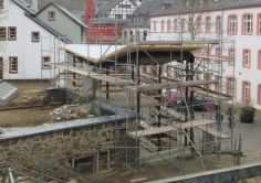Der kleine Glaspavillon entfaltet sich auf einem Natursteinsockel bergauf wie die Stadtmauer um die zentrale Bar mit Kronleuchter über eine Empore bis auf das Dach des Bestandsgebäudes, wo eine große Dachterrasse mit Rundum-Blick auf Stadtmauer und Berghang, Rathaus und Altstadtgebäude zum aussichtsreichen Zwischen-Stop einlädt.