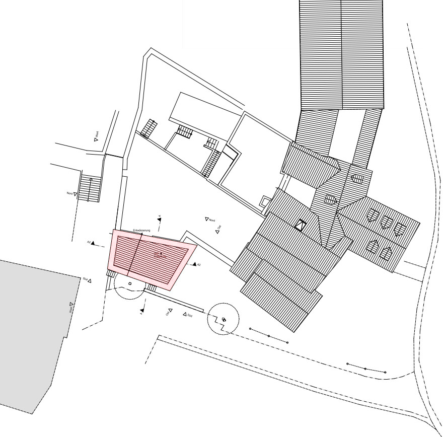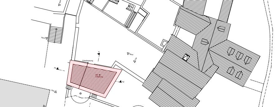 Darüber legt sich ein umgekehrtes Satteldach aufwärtsstrebend wie ein großer Flügel als modernes Pendant zu den heimeligen Altstadtdächern.
