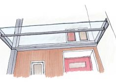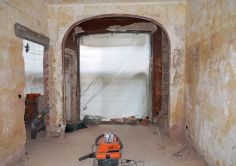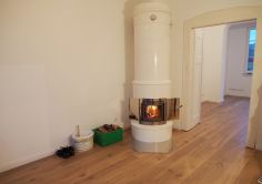 Verborgen und verdunkelt unter vielen Schichten von Plastik, Kleber, Fliesen, Teppich und Gipskarton und nachkriegserweitert um etagenweise Notbäder und Küchen in den ehemaligen herrschaftlichen Loggien war die alte märchenhafte Großzügigkeit hoher Wohnräume um eine als vertikale Raumachse fungierende gewendelte Holztreppe gerade noch zu erahnen.