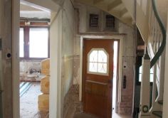 Das Haus wurde bis auf den Rohbau entkleidet, konstruktiv ertüchtigt, erhielt neue räumliche Verknüpfungen, Installationen, Küche und Bäder, ein mit Zellulose gedämmtes Dach, vergrößerte Holzfenster, einen skandinavischen Grundofen im Esszimmer u.v.m.. Der alte wohngesunde (schimmelverhindernde, feuchteregulative, luftschadstoffbeseitigende) Kalkputz innen wurde freigelegt u. mit passenden kalkbasierten Putzen und Farben behutsam ergänzt. Nun ist alles licht, hell und weit.