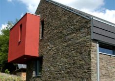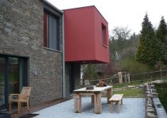 Einen überraschenden Kontrast zu der massiven Grauwacke-Fassade bildet die rote "Badbox" im DG, die aus dem Schlaftrakt über den Schwimmteich auf der Gartenseite auskragt - Wellness-Baden mit Blick auf die Rehe am Waldrand…