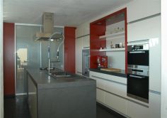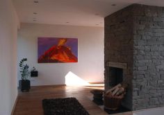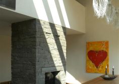 Durch eine Sichtbeton-Gartenmauer verdeckt, erschließt der Eingang in der sonst geschlossenen Grauwacke-Fassade zunächst das Souterrain. Eine einläufige Treppe führt den Hang in die weite Helligkeit von Ober- und Galeriegeschoss hinauf, - den Ausblick nach Süden über den Rhein und nach Norden Richtung Garten und Waldrand unterstreichend. Den zentralen Ort von Wohn- , Ess- und Galeriebereich bildet ein geschosshoher mit Bruchstein ummauerter Kamin.