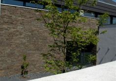 Ausblick, Hanglage mit Straße u. talseitiger Erschließung von Süden, sowie der Wunsch nach Geborgenheit hinter massiven Bruchstein-Mauern bildeten die Entwurfsparameter. Der schlichte langgestreckte Kubus mit asymmetrischem Satteldach ist parallel zum Hang über Terrassen mit dem Grundstück verzahnt.
